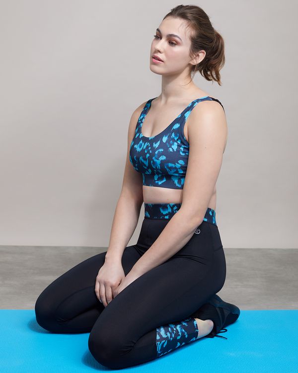 With electric blue leopard print cuffs and waistband, these leggings are made in a breathable, fast drying fabric with four-way stretch and moisture management technology.