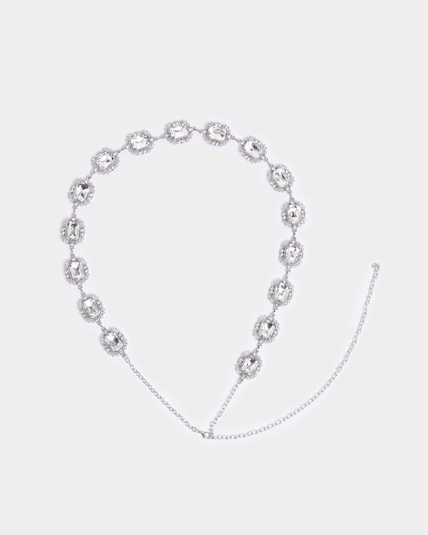 Give your line-ups a glamorous uplift with this belt. In a silver-toned design, it presents faceted gem embellishments.