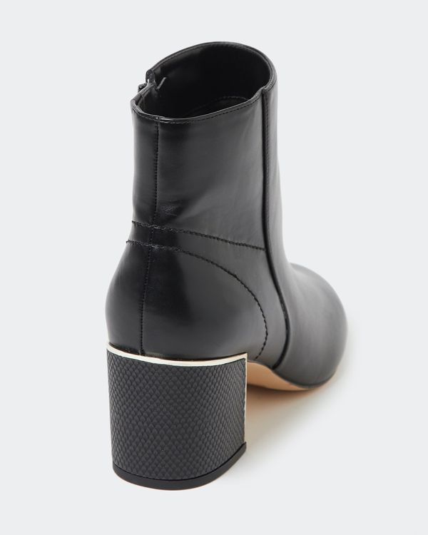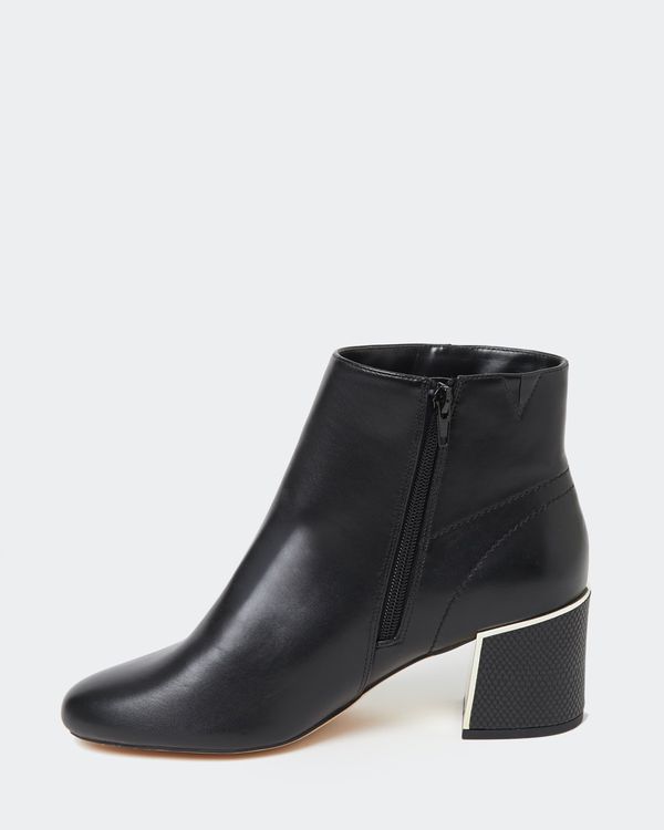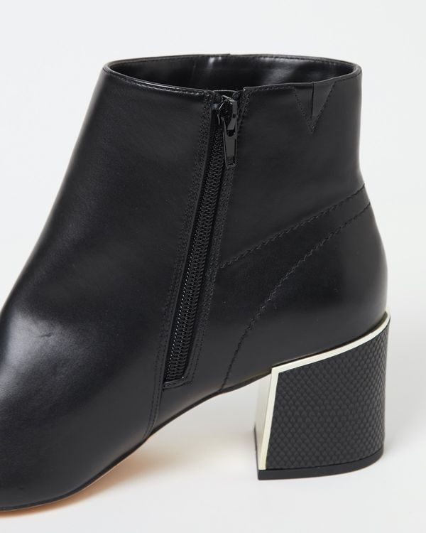 Add a classic touch to your daily wardrobe with these black boots. They feature a side zip, almond toe and croc-effect block heel with gold-toned detailing.