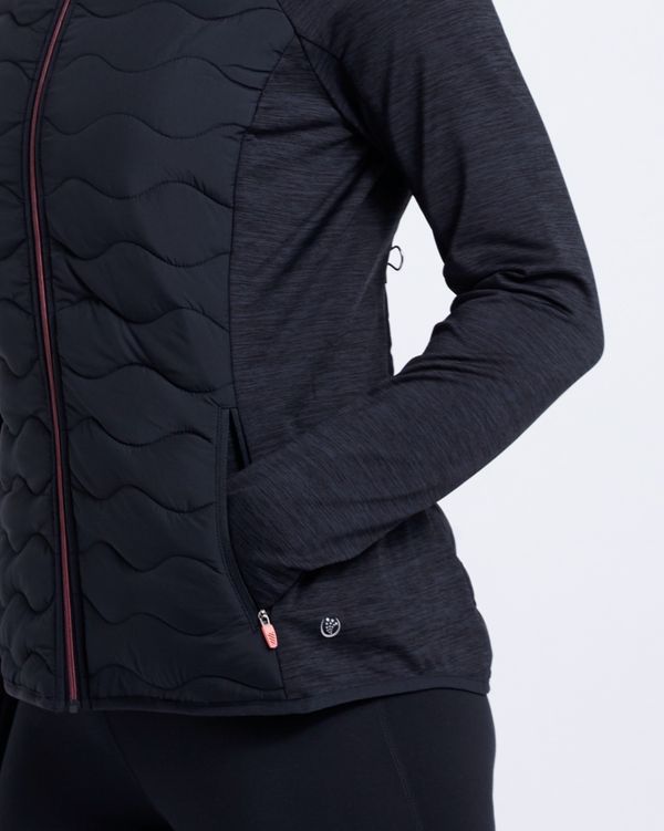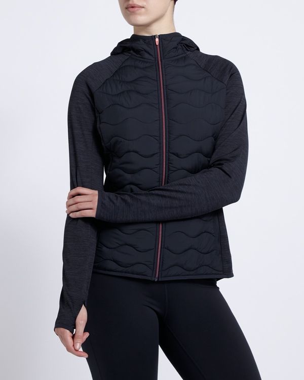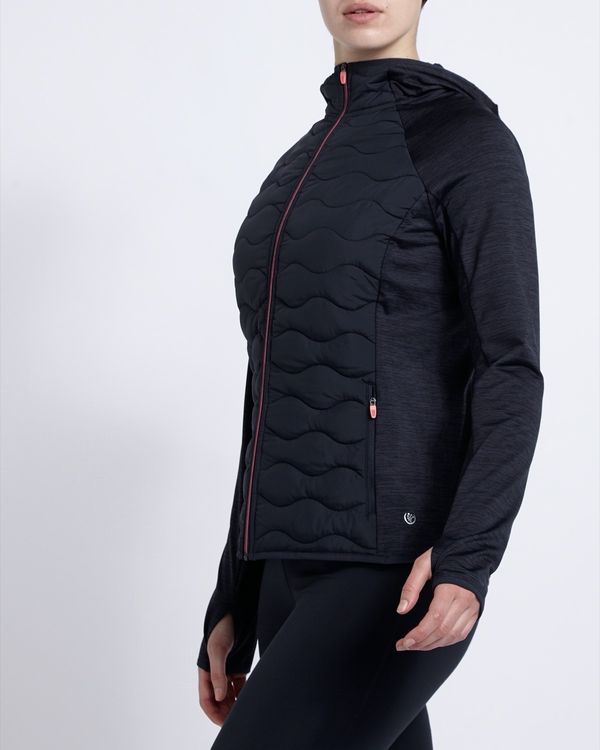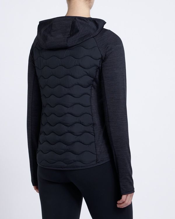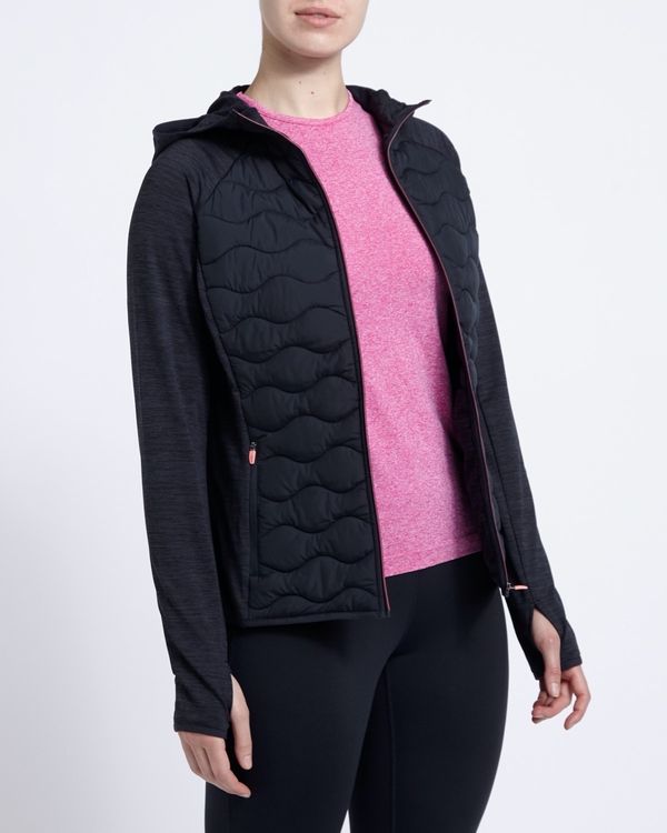 This hooded jacket features padded panelling that offers lightweight warmth. Incorporating ergonomic seams and stretchy side panels that enhance your range of motion, this zip-up piece is finished with side pockets.