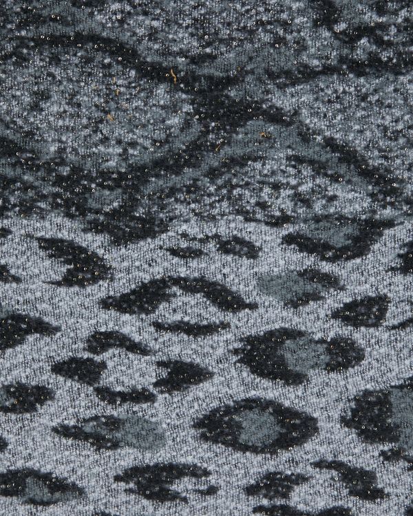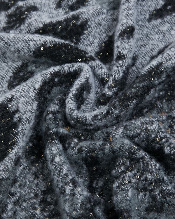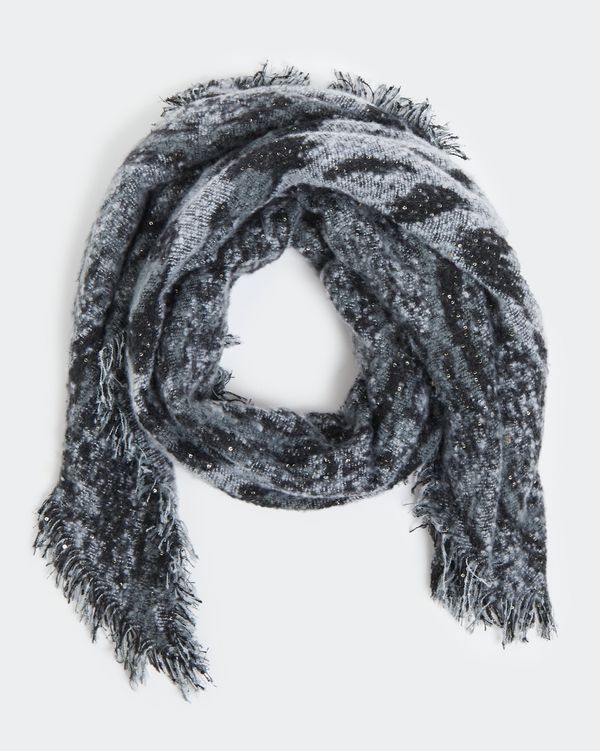 This supremely soft scarf is designed with a leopard print in shades of grey. Finished with a scattering of gold sequins, it will provide a fashionable yet warm addition to your wardrobe.