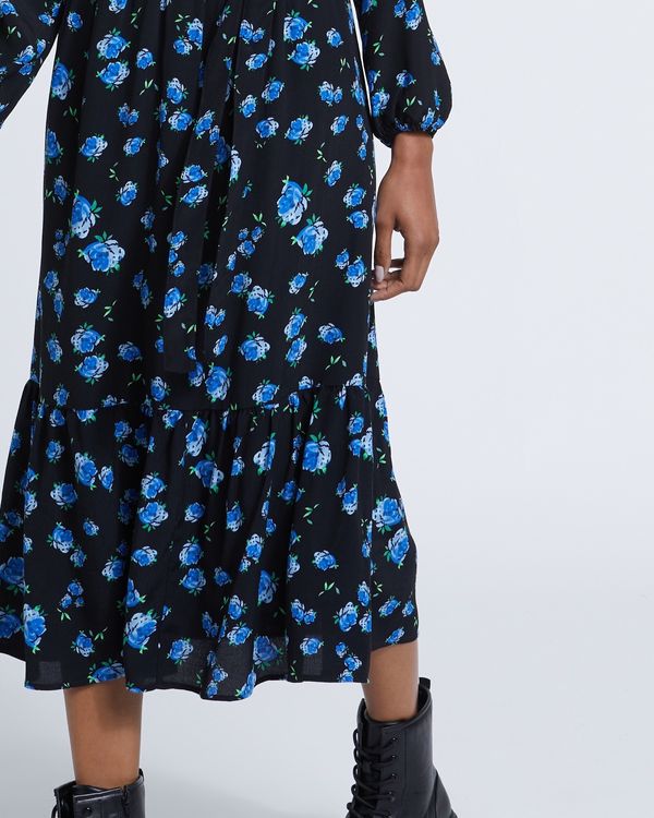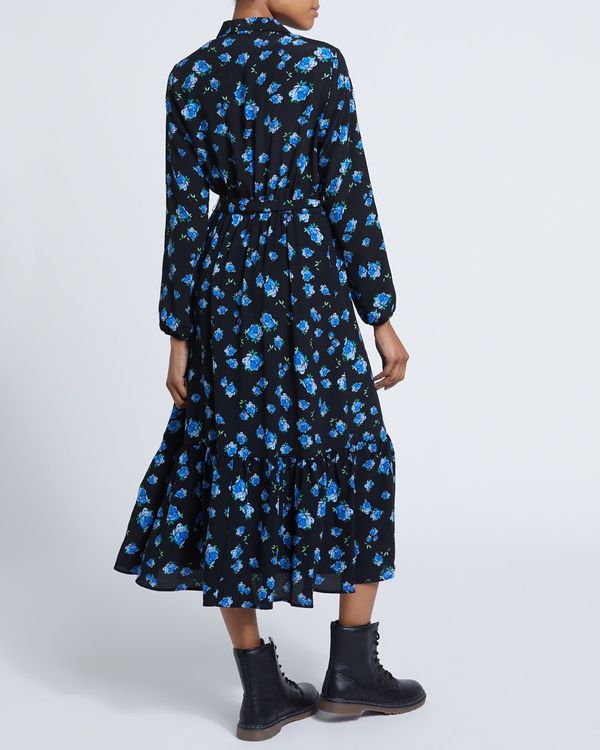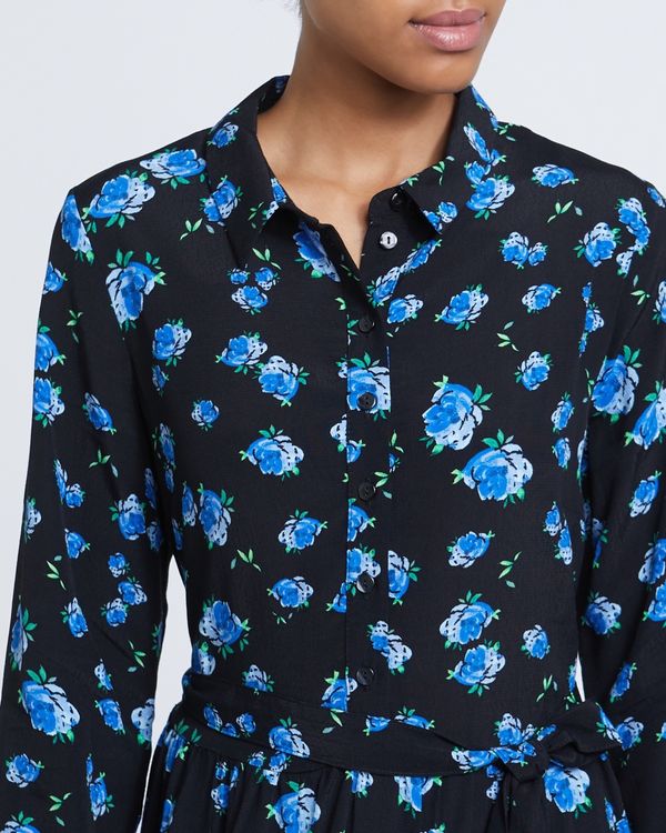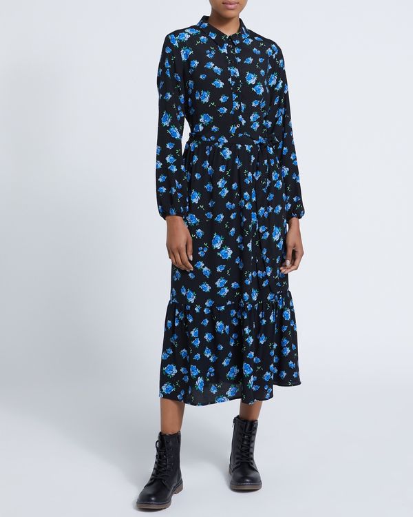 Graced with a splendid floral print, this midi-length shirt dress is crafted in a flattering relaxed fit. Featuring tonal buttons, it presents a self-tie fastening at the waist.