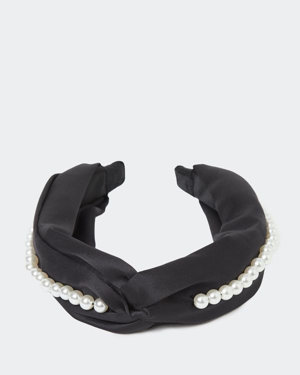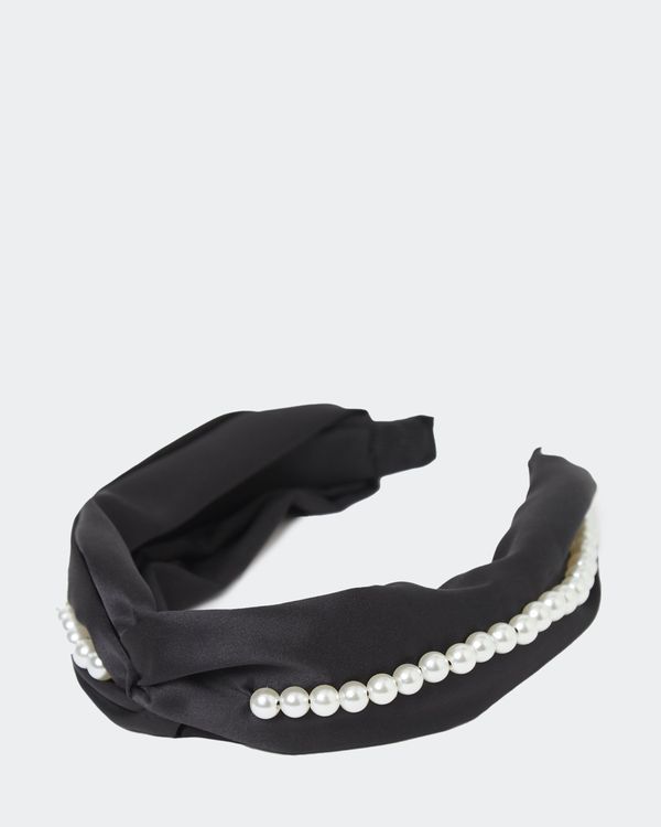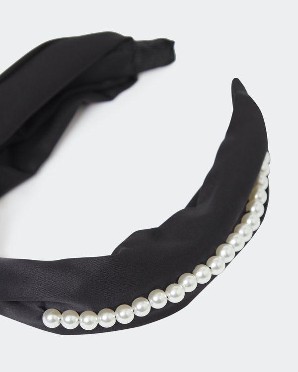Embellished with a pearl trim, this black satin headband is the epitome of classic style.