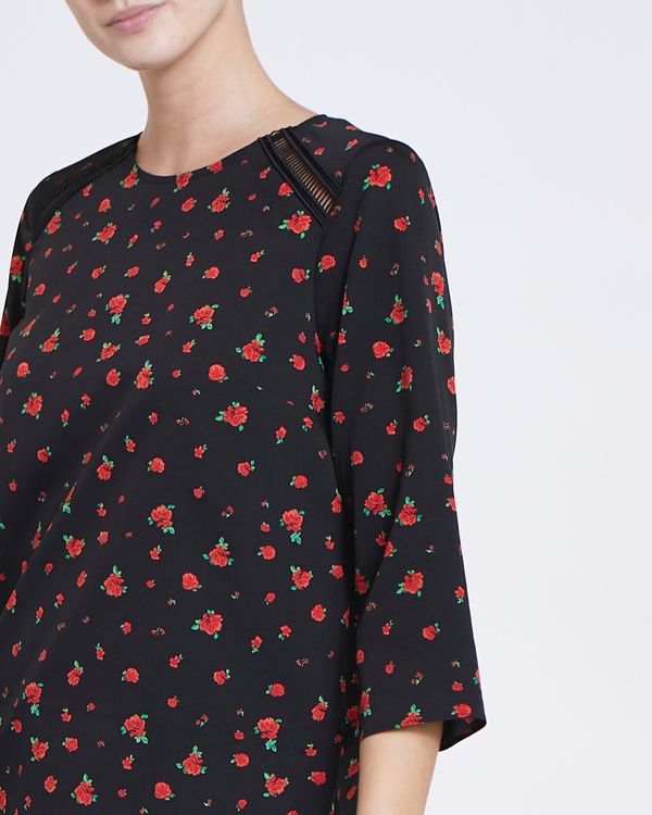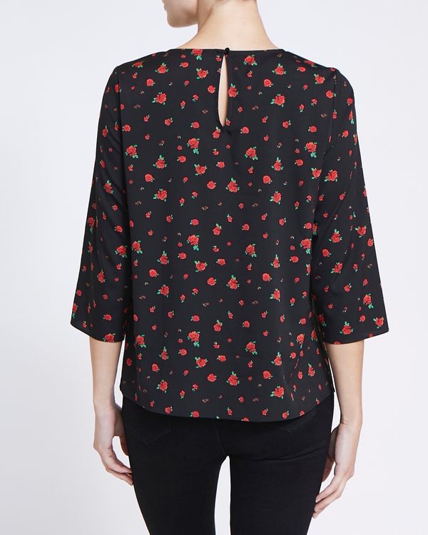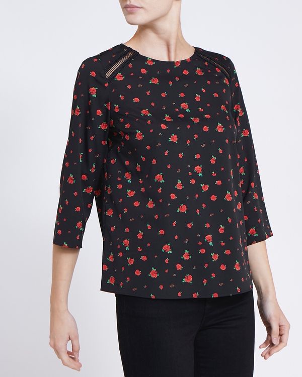 Brought to life with a fetching all-over print, this relaxed-fitting top features embellished trims at the shoulder for added interest.