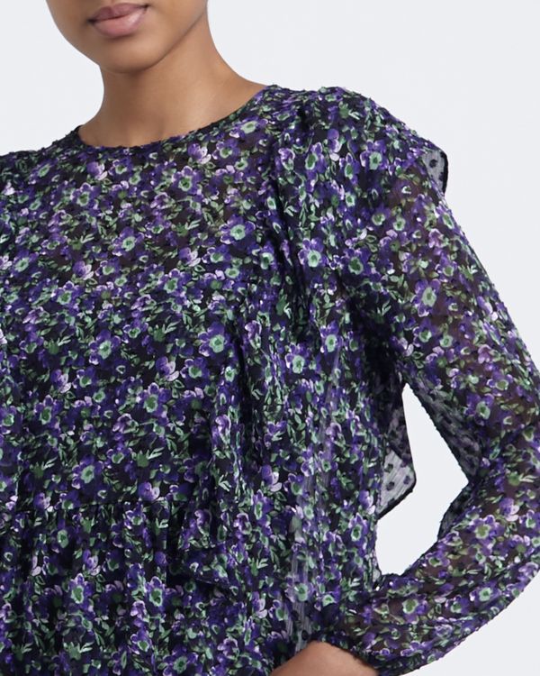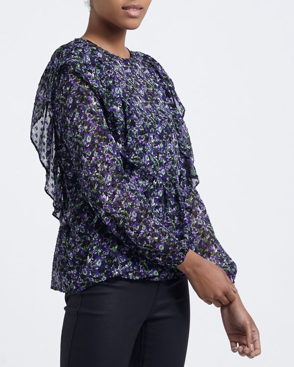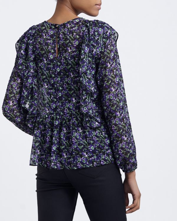 This pretty floral print top will work equally well with jeans at the weekend, or more formal trousers at work. Made in a slightly sheer fabric, with ruffles cascading from the shoulder and elasticated cuffs.