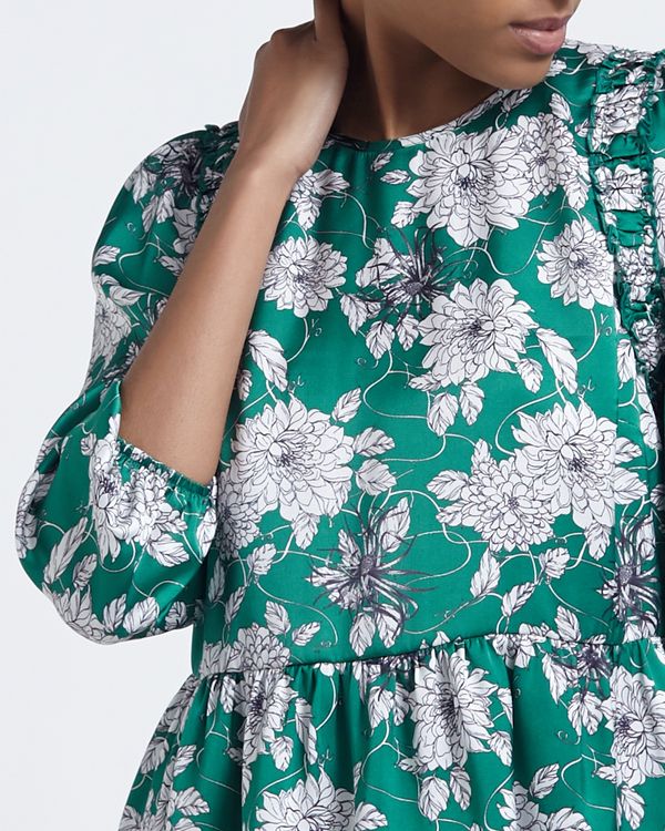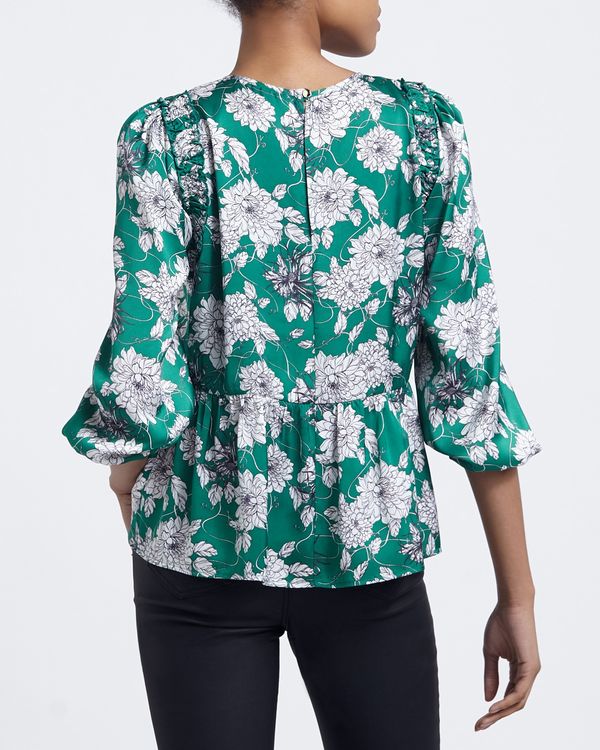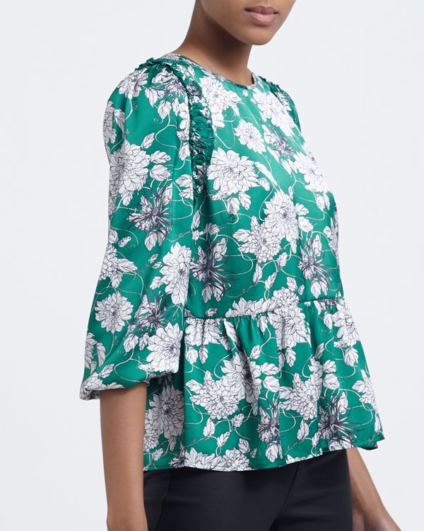 Crafted with a silky-feel fabric, this floral print top features a ruffle shoulder detail and a slight peplum.