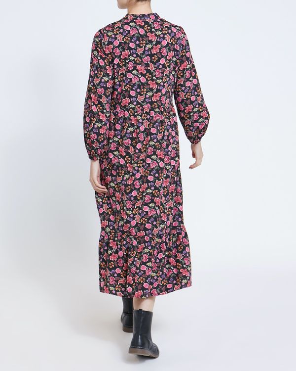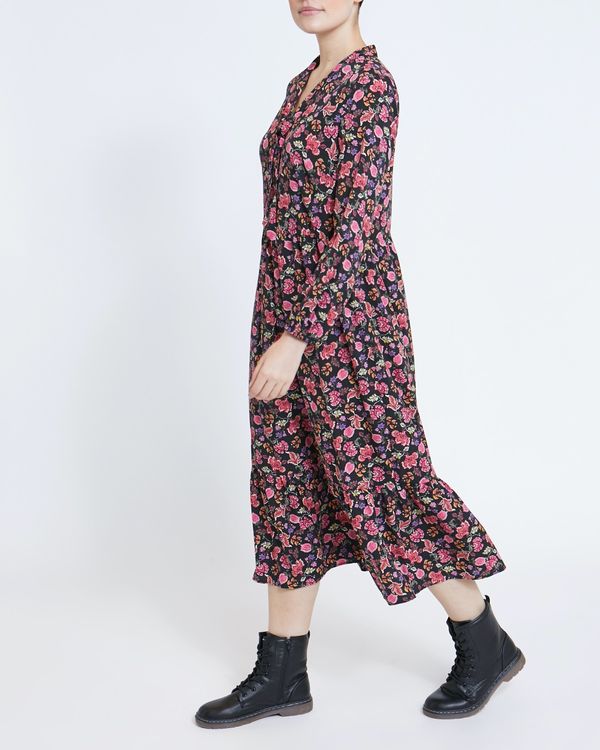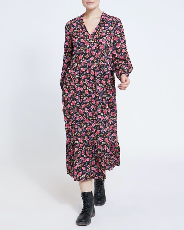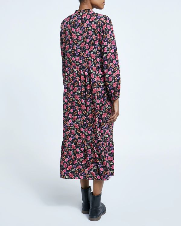 Effortlessly stylish, this floral print midi dress is detailed with long, elasticated cuff sleeves, a V-neck and a self-tie neckline. Perfect for occasions.