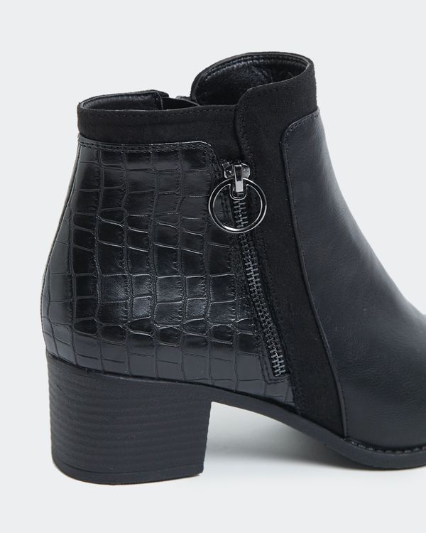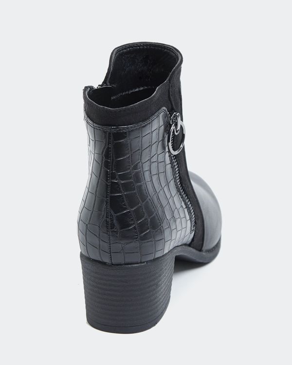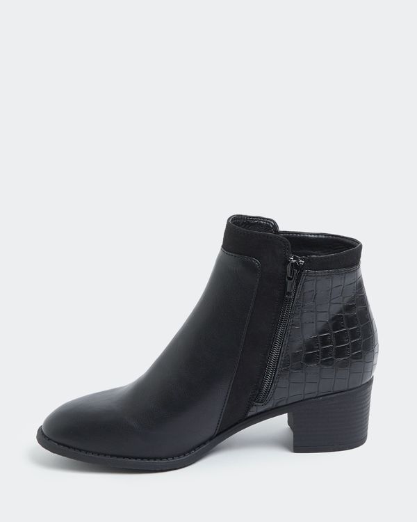 With a block heel and an almond toe, these leather-look boots will take you straight from work to weekend. Designed with two side zips and a crocodile-effect back, they effortlessly add to your style credentials. Our wide fit offers a more generous fit for extra comfort.